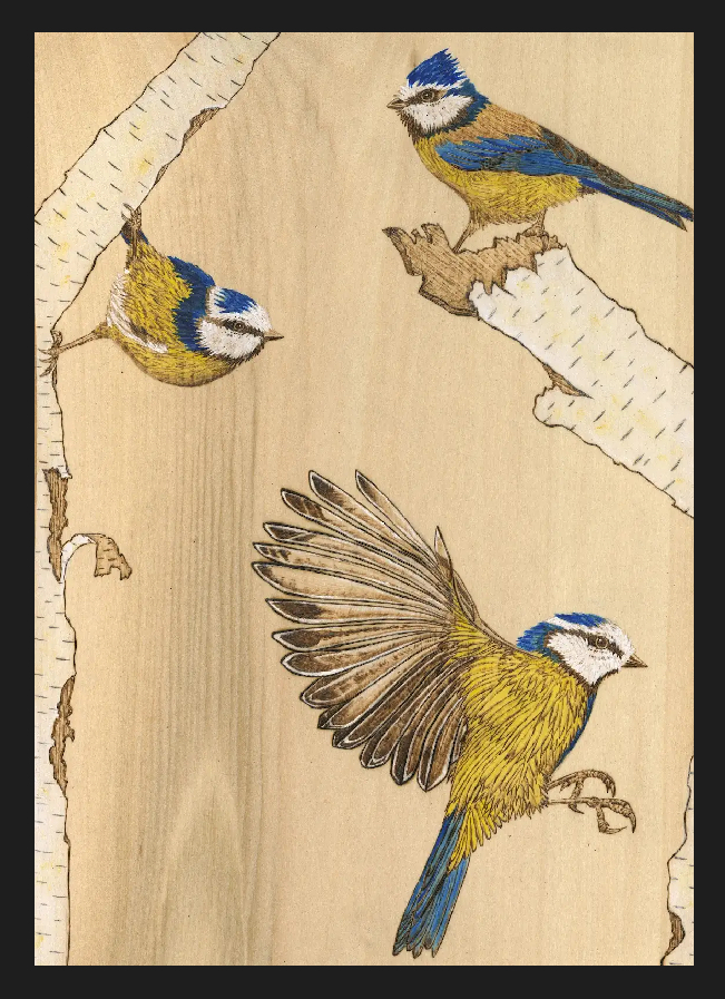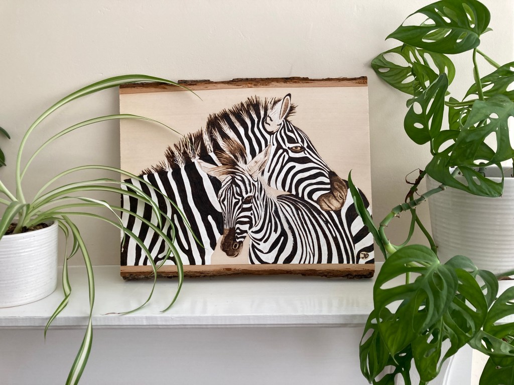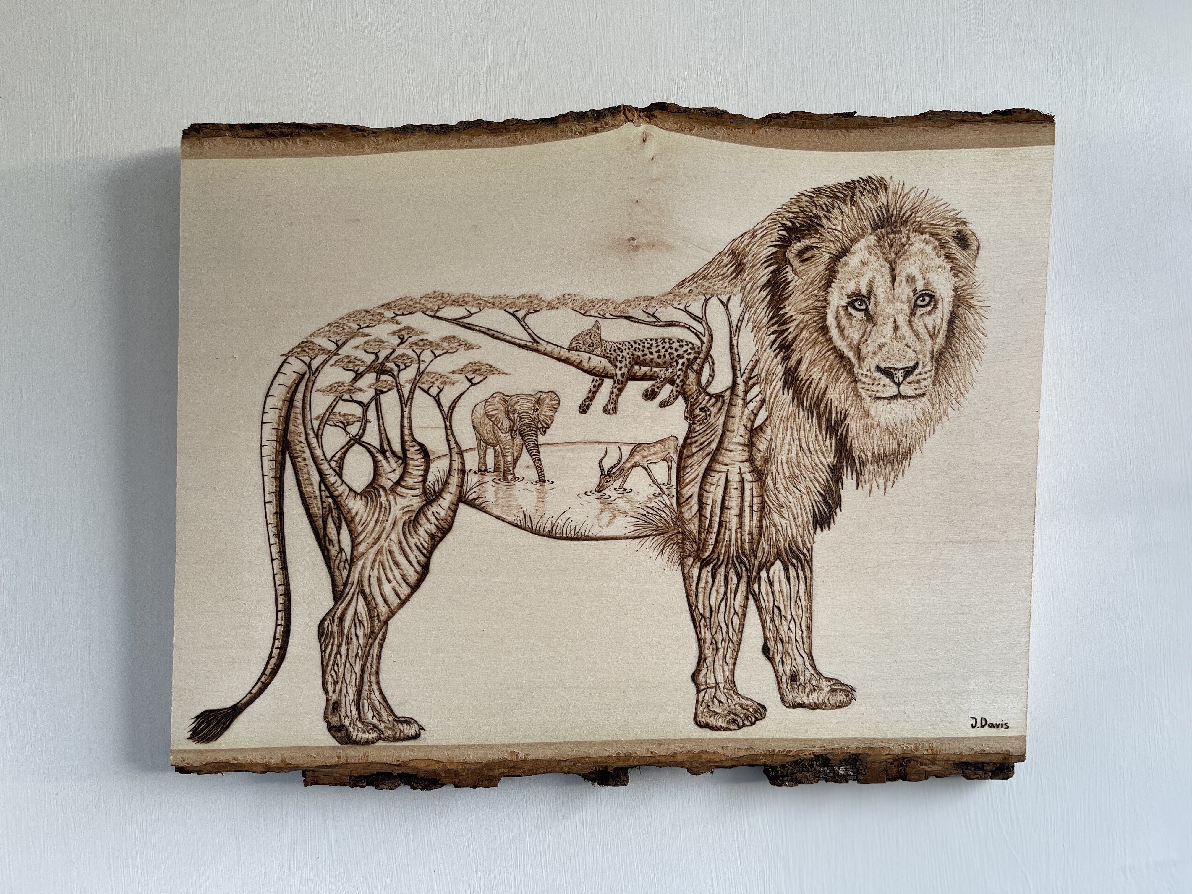 Pyrography is the process of using a hot nib to burn into wood. I use a variety of nib shapes and varying temperatures to create the effects in my art. I also use acrylic paints to accent some pieces (for example the zebras or goldfinch)